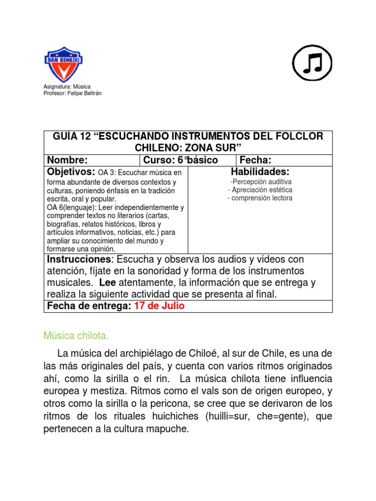 Música 6to Guía 12 Escuchando Instrumentos Zona Sur Chiloé Descargar gratis PDF Instrumentos
